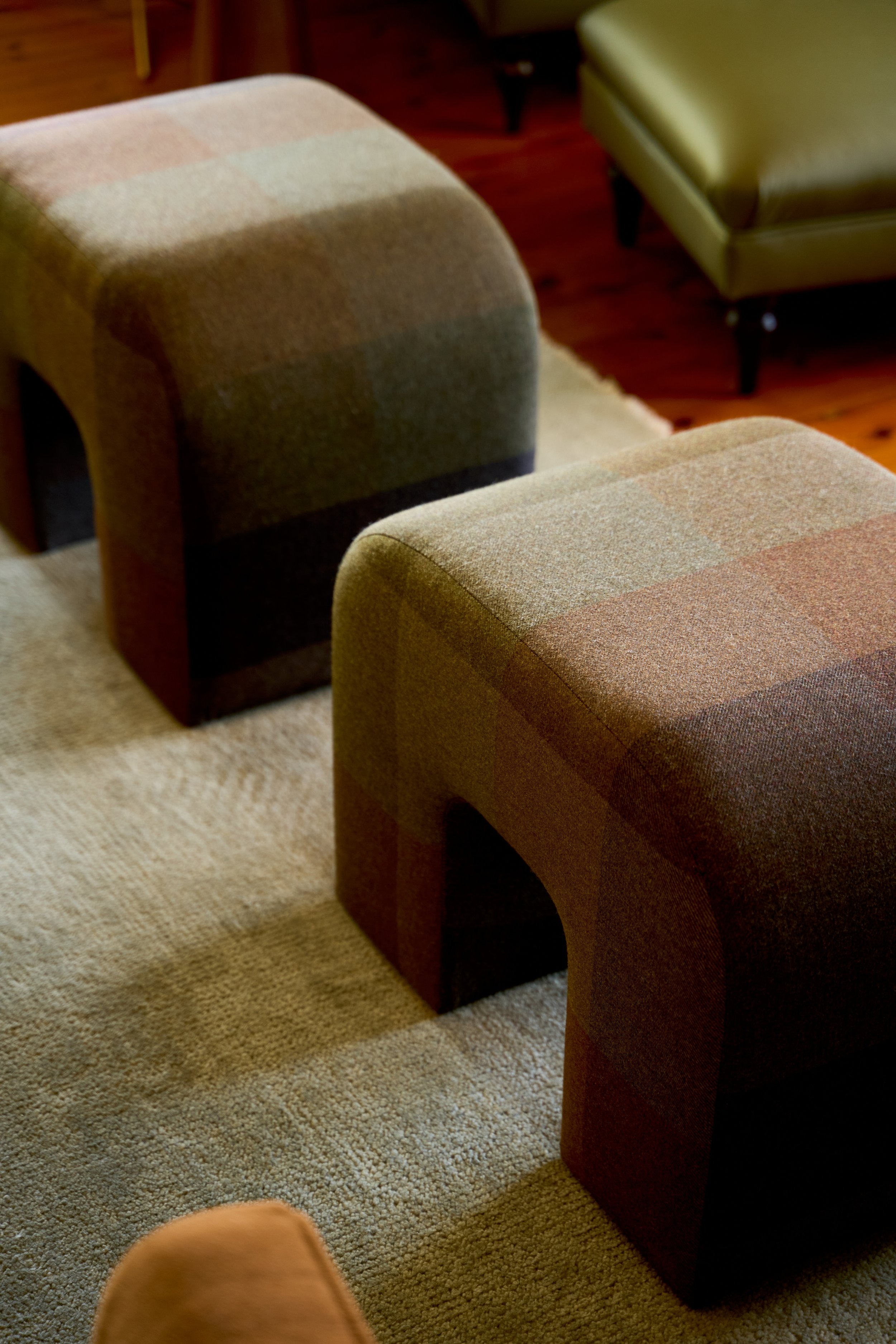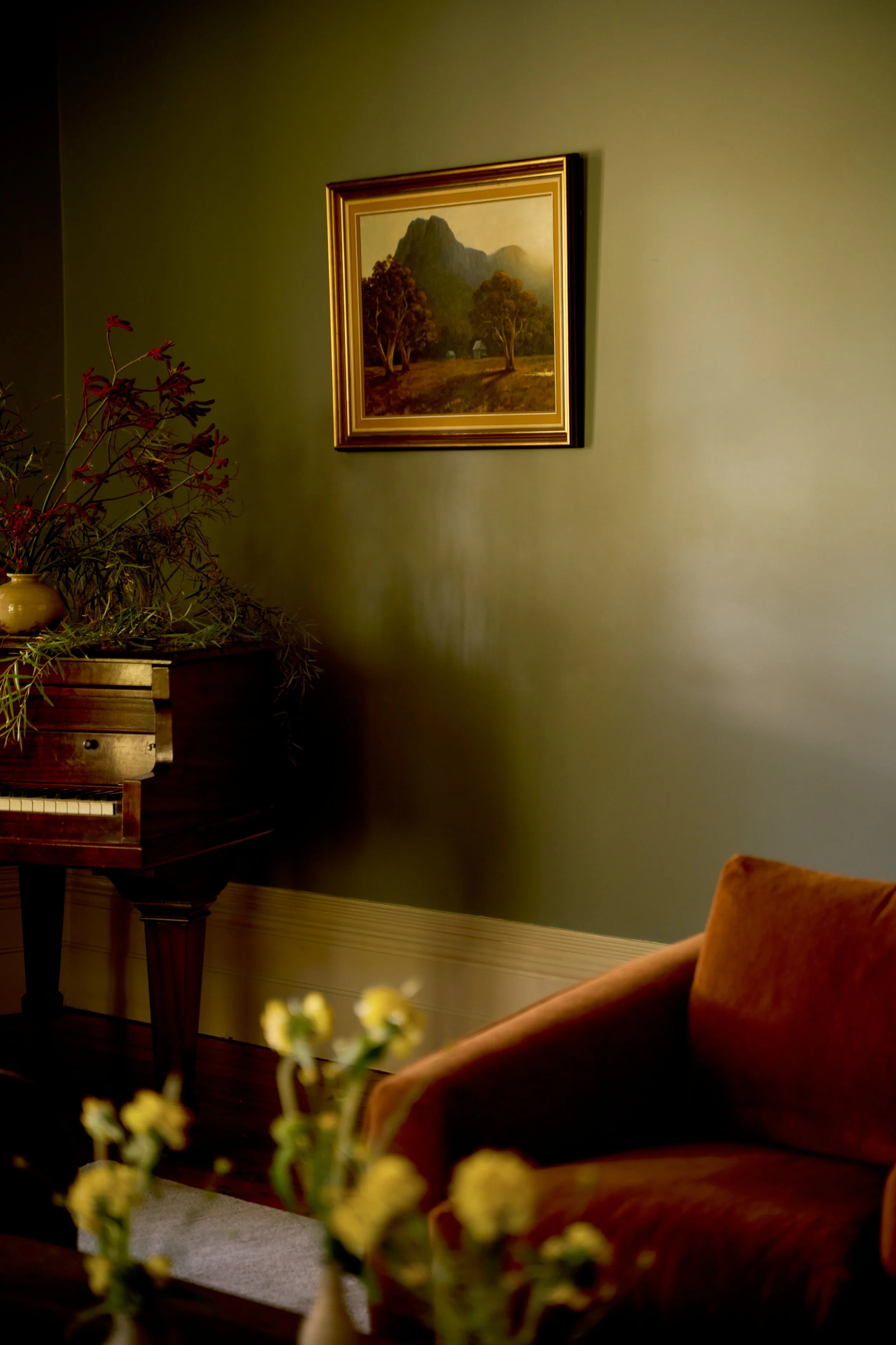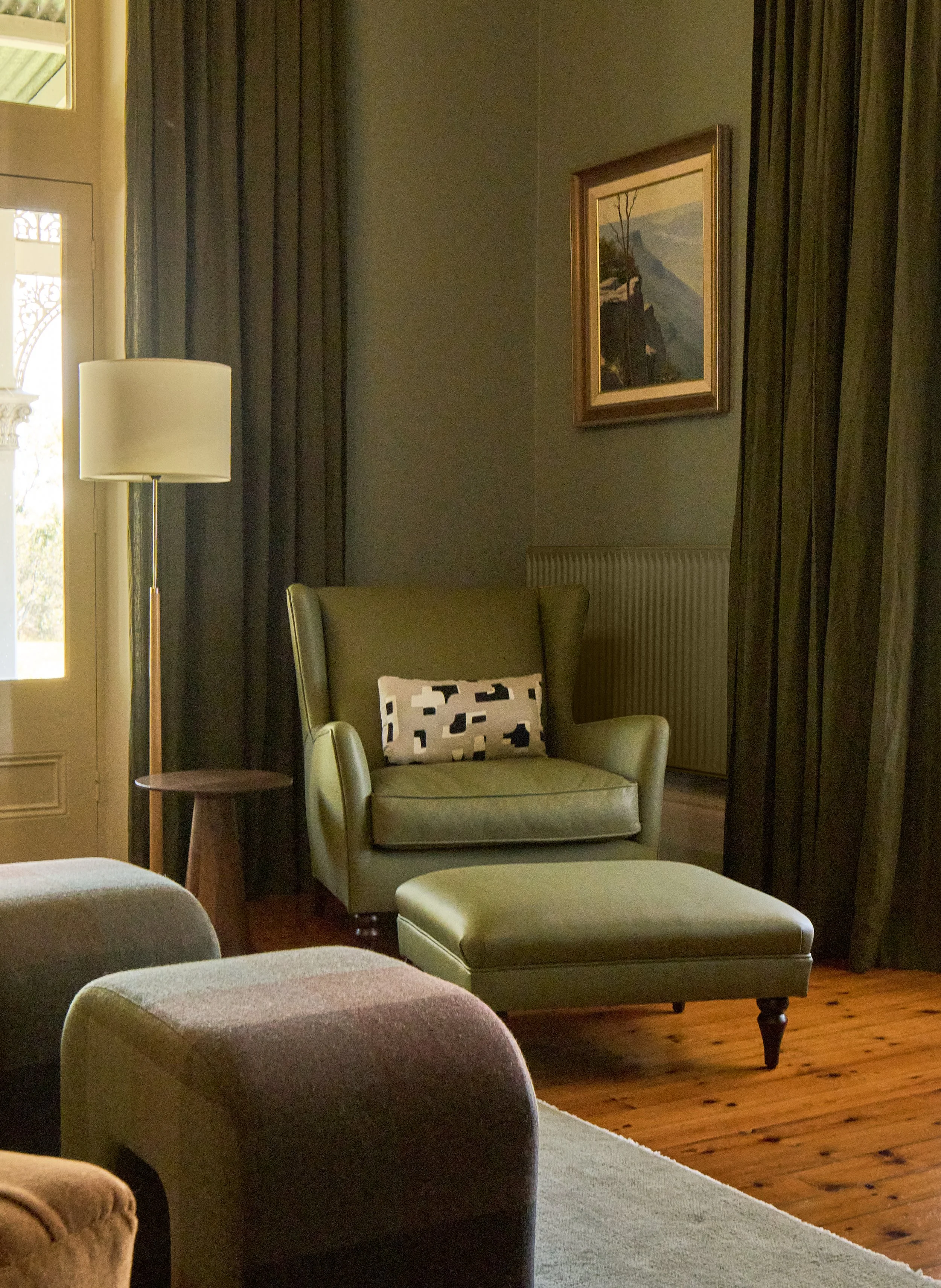The colour and material palette draws on local context and historic materiality — from the dusk light on Wurgarri to the homestead’s quarried stone and rich farming heritage — resulting in a base of stony blues, straw-like neutrals and deep greens that put guests instantly at ease.