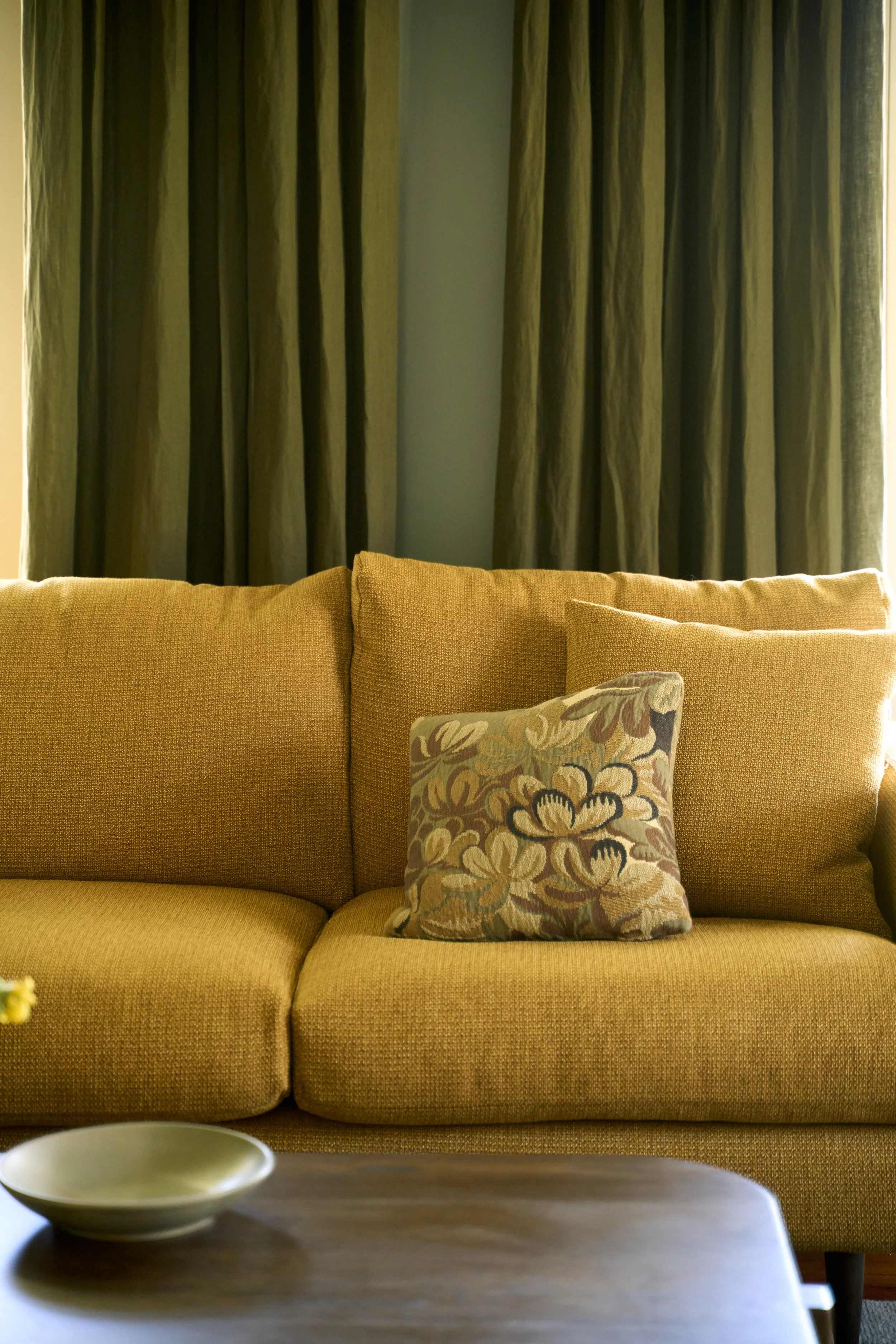 The deep set sofa is upholstered in a rich golden fabric references a particular point on the mountain that glows when the light hits it ‘just so’ in the evening.