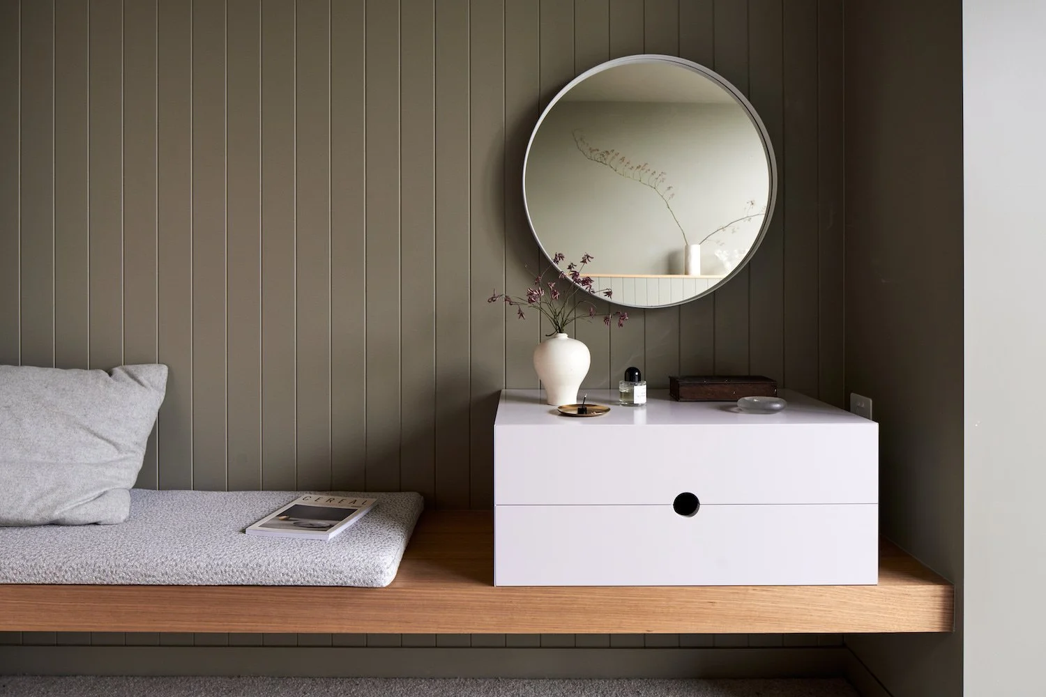 Moments of delight unfold as one journeys through the home, culminating in the main bedroom that transitions from a cocooning deep grey to an olive green depending on the ever changing northern light.